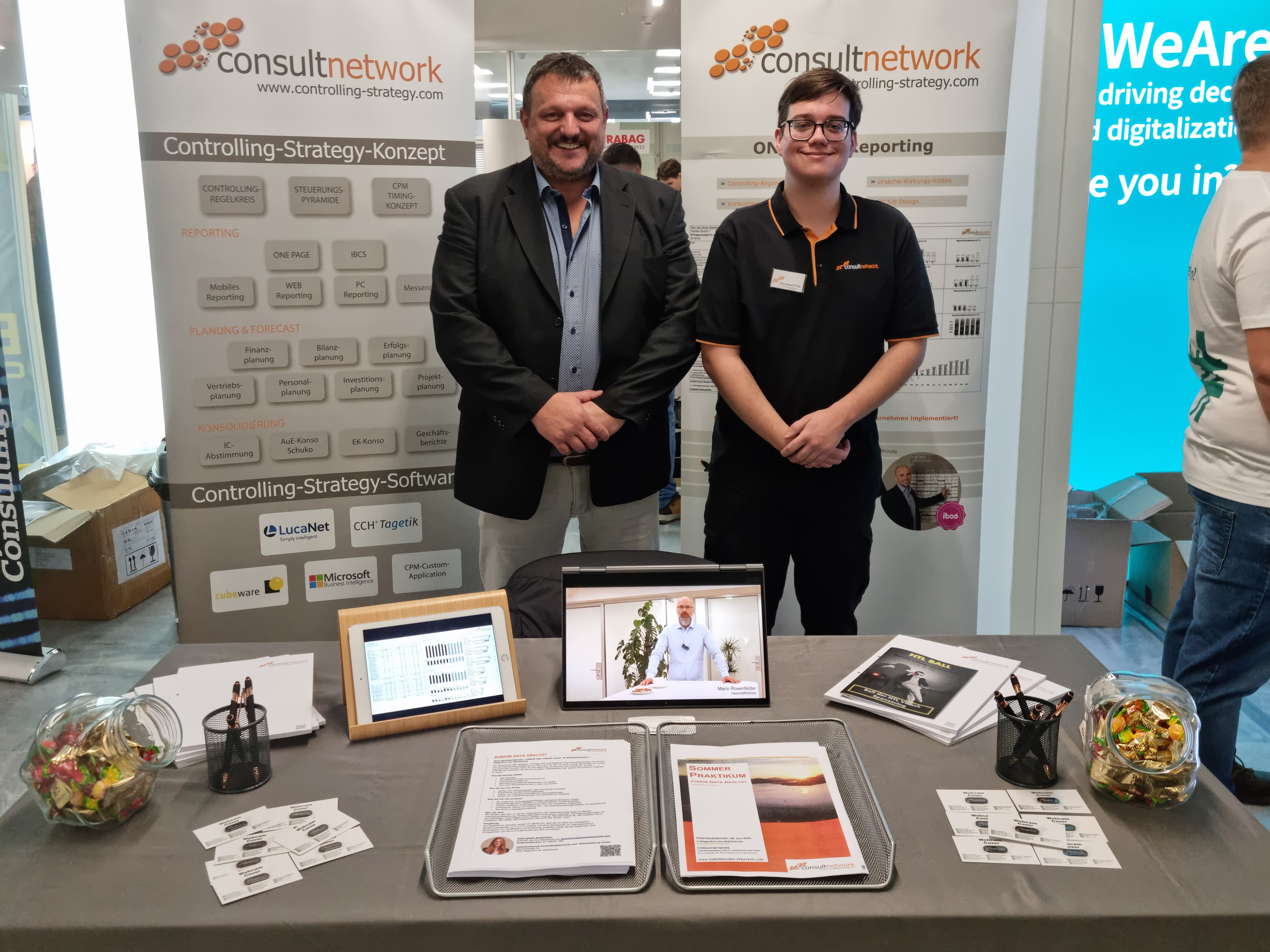 Es hat uns besonders gefreut, viele bekannte Gesichter wiederzusehen! Anna, unsere Sommerpraktikantin 2024, hat uns an unserem Stand besucht, und auch Sophie war vor Ort und stellte uns ihren Diplomarbeitspartner Leon vor. Mein Kollege Christoph, der selbst bei uns im Unternehmen als Praktikant angefangen hat und uns nun schon seit einem Jahr als Junior Data Analyst unterstützt, konnte den Besucher:innen am Stand mit seinen Erfahrungen einen perfekten Einblick in unser Praktikum sowie die Stelle des Junior Data Analysten geben. Christoph traf zudem auf viele ehemalige Lehrer*innen, die sich freuten, ihn wiederzusehen – darunter Herr Eder, Abteilungsvorstand für Informatik, und Herr Ortner, Professor für Programmieren, Software-Engineering und Datenbanken.