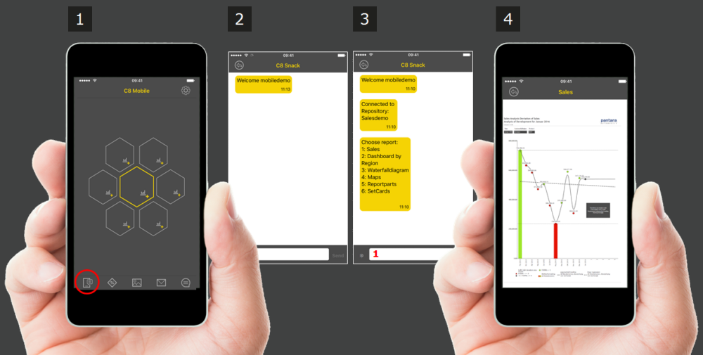 Mit der Messenger-App C8 Snack bekommen Sie dringend benötigte Daten und Informationen in Sekundenschnelle über eine Chat-Funktion auf Ihr Smartphone zugestellt. So wird es möglich, Ihre Mitarbeiter einfach und kostengünstig in die Berichtskette einzubinden. C8 Snack kann in Ihren Business Messenger, wie Skype for Business oder Telegram, integriert werden und aktuelle Berichte bereitstellen. Ihre Mitarbeiter benötigen hierzu weder eine Schulung, noch BI Know-how und sind trotzdem egal wann und wo bereit wichtige Entscheidungen zu treffen.
