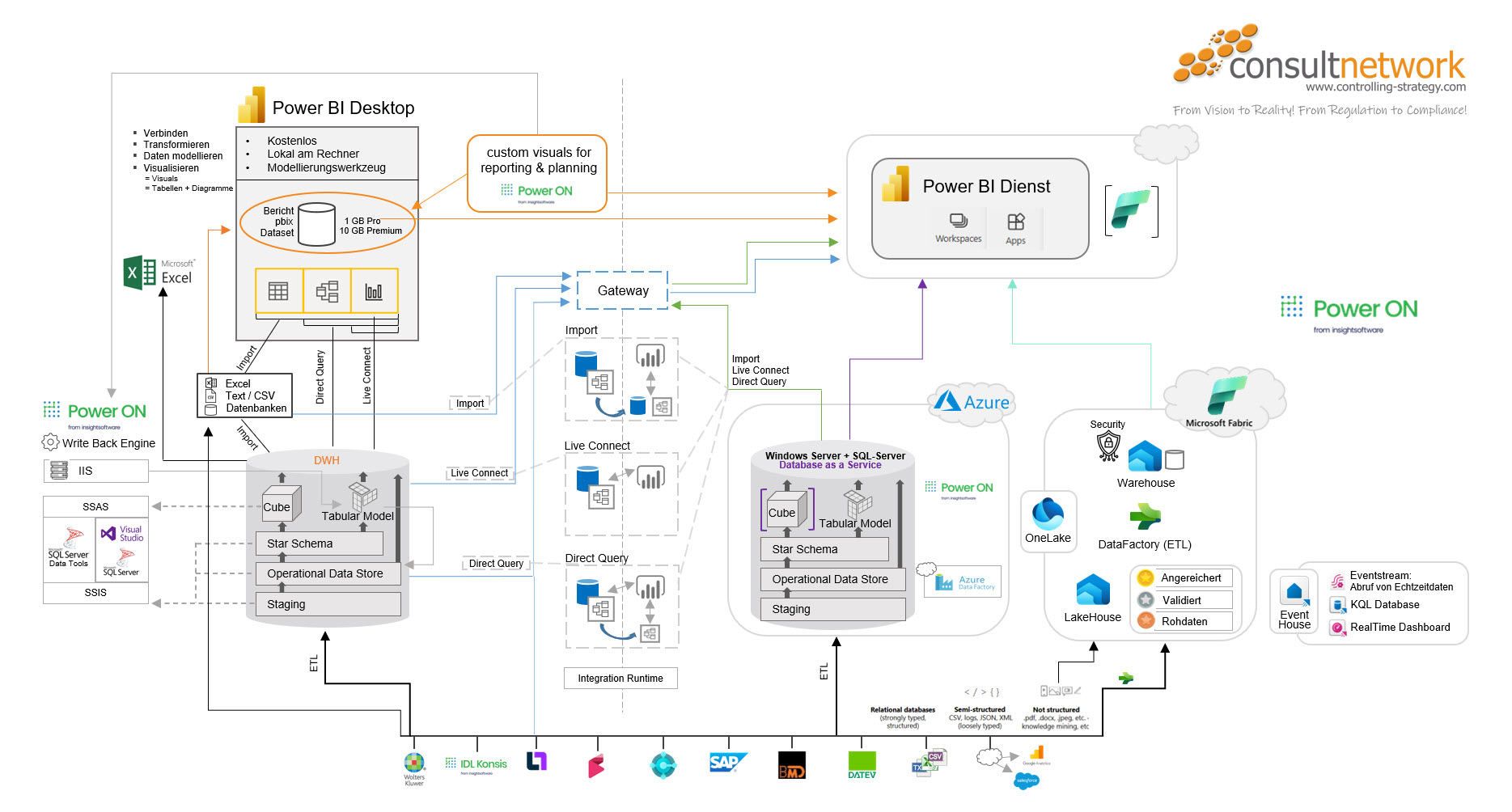 - Power Query: Hier erfolgt der Datenabzug aus unterschiedlichen Datenquellen und deren Aufbereitung.