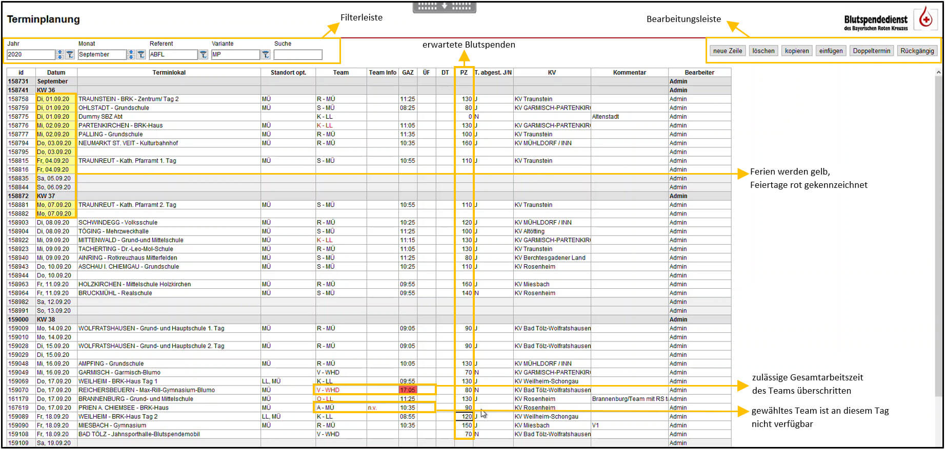 In der zentralen Planungsmaske für die Terminplanung gibt es eine Filterleiste, mit der festgelegt werden kann, für welches Jahr und für welchen Monat geplant werden soll. Der Referent wird auf Basis des Windows-Users ermittelt, berechtigte User können zwischen den einzelnen Referenten umschalten. Eine Liste mit allen Tagen des gewählten Monats gegliedert nach Kalenderwochen wird ausgegeben. Im Standard werden für jeden Wochentag zwei Zeilen in der Liste angezeigt, selbstverständlich können bei Bedarf weitere Zeilen ergänzt oder vorhandene Zeilen gelöscht werden. Hier wurde versucht, optimal auf die Anforderungen der Bediener einzugehen. Wird ein neuer Termin geplant, greift das System auf die Liste der Terminlokale zu. Die Lösung ermittelt automatisch, welcher Team-Standort dem gewählten Terminlokal am nächsten ist. Im Idealfall wird dann ein Team von diesem Standort eingesetzt. Ist das gewählte Team an diesem Tag nicht verfügbar oder wird durch die Planungsaktivität die zulässige Gesamtarbeitszeit des Teams überschritten, bekommt der Planer sofort eine Information und kann ein anderes Team auswählen. Zusätzlich kann der Planer auch festlegen, wie viele Blutspenden er für einen Termin erwartet.