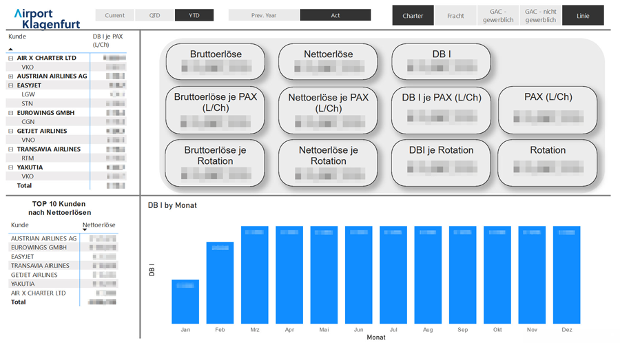 Ziel des Projektes war es, im Zuge der Digitalisierung des 2018 übernommenen Flughafen Klagenfurt, dessen Flugverkehrsstatistiken auf Basis der Flugbewegungen, Passagieranzahlen und Auslastungen der Luftfahrzeuge auszuwerten. Darüber hinaus sind die finalen Flugziele für den Kunden von großer Relevanz, um die Attraktivität der Endziele evaluieren und bewerten zu können. Außerdem wurden die Fakturierungsdaten aus dem Vorsystem übernommen, um im Reporting eine individuelle DB1 Rechnung darstellen zu können.