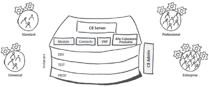 Mit dem neuen C8 Server hat Cubeware massiv aufgerüstet. Der C8 Server verfügt in allen Editionen über zwei Instanzen, die es ermöglichen Produktivumgebung und Entwicklungsumgebung voneinander zu trennen. Bei den größeren Servereditionen steht Ihnen auch noch eine Testumgebung sowie eine Standbyumgebung zur Verfügung, womit die qualitätsgesicherte Weiterentwicklung und der 100% ausfallsichere Betrieb der unternehmensweiten BI-Umgebung möglich wird.