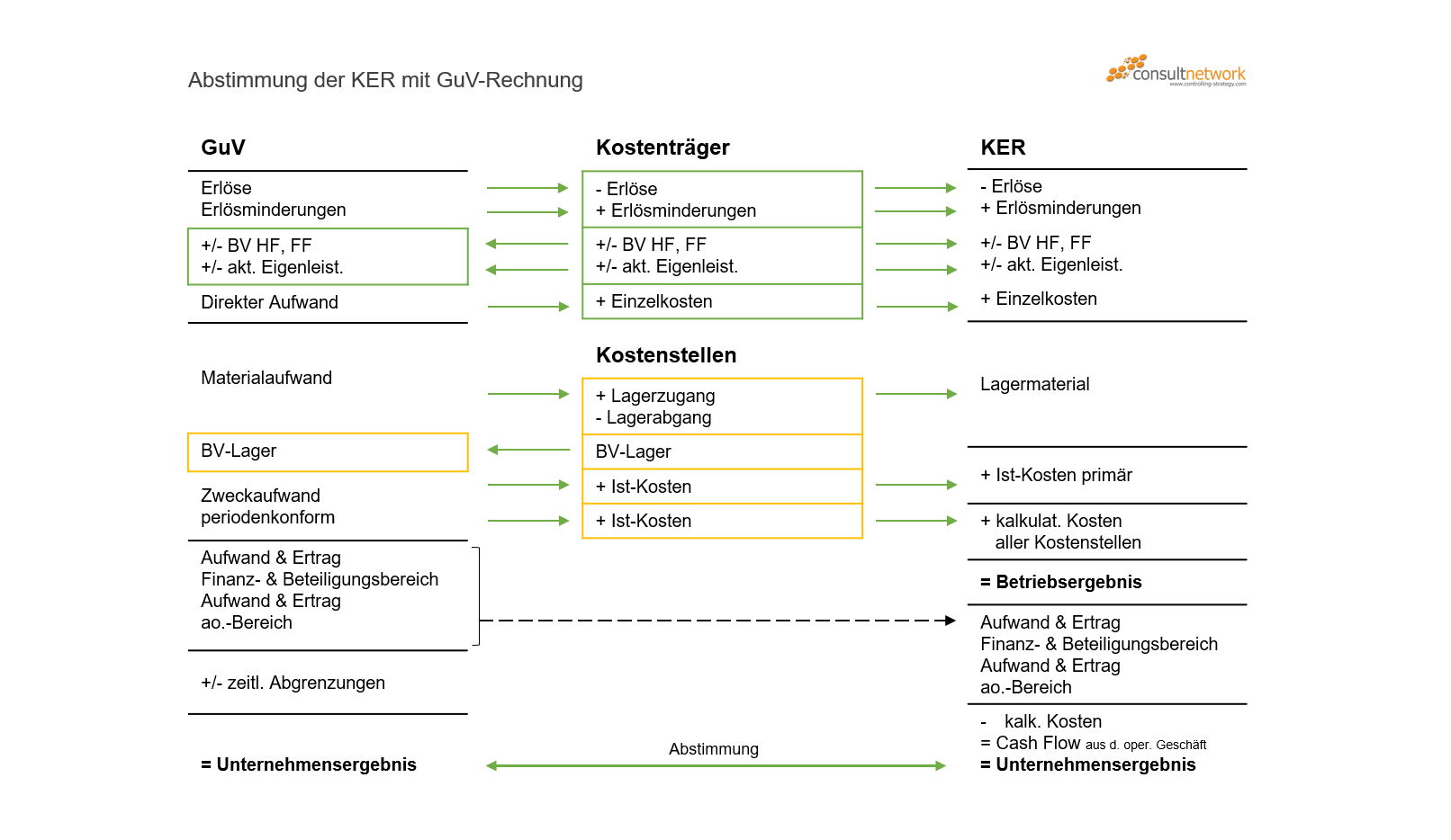 Dies ist deshalb besonders wichtig, weil jede Einzelaussage (Kostenstelle und Kostenträger) nur dann ihre Glaubwürdigkeit beweisen kann, wenn sich zusammen mit dem Rest das Ganze ergibt. Für die Abstimmung mit der GuV wird eine Abstimmbrücke definiert. Die Abweichungen zwischen kalkulatorischen und Ist-Kosten werden entsprechend addiert und die Ergebnisse der finanziellen und außerordentlichen Bereiche werden ergänzt und so das Bilanzergebnis errechnet.