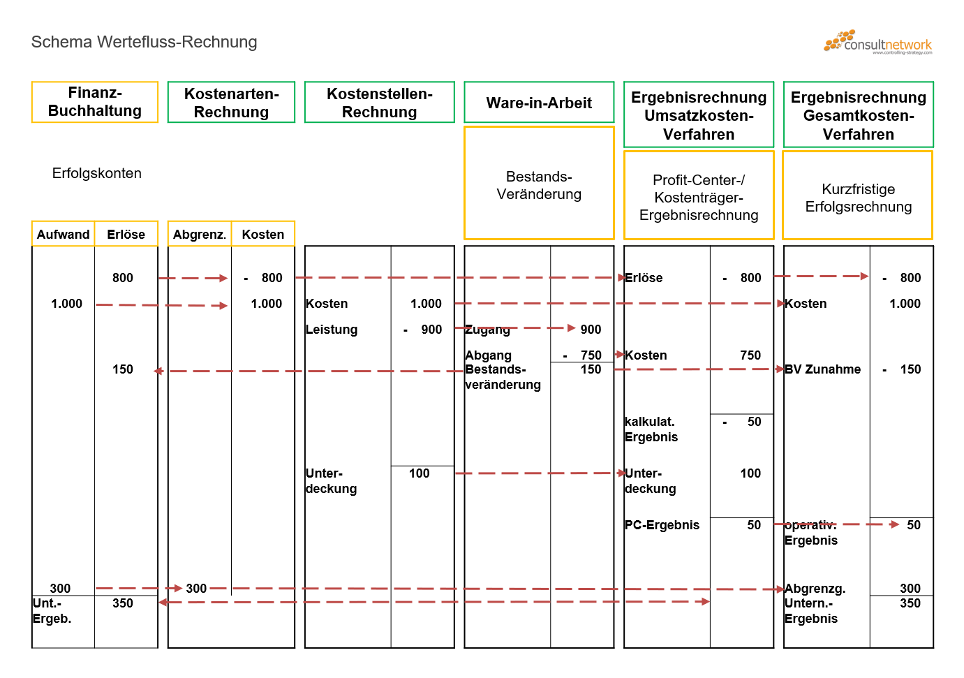 Für die Ermittlung der Sollkosten einer Periode werden die proportionalen (variablen) Plankosten der Ist-Beschäftigung angepasst. Die fixen Plankosten werden 1:1 als Sollkosten übernommen. Die Ist-Kosten aus der Finanzbuchhaltung und den Hilfsrechnungen werden den Sollkosten gegenübergestellt und so die Verbrauchsabweichungen ausgewiesen. Wichtig ist: für die Umlagen werden immer die Plan-Kosten belastet und der abgebenden Kostenstelle gutgeschrieben (commitments), da die Abweichungen beim Verursacher aufgezeigt werden müssen, damit man sie beurteilen kann.