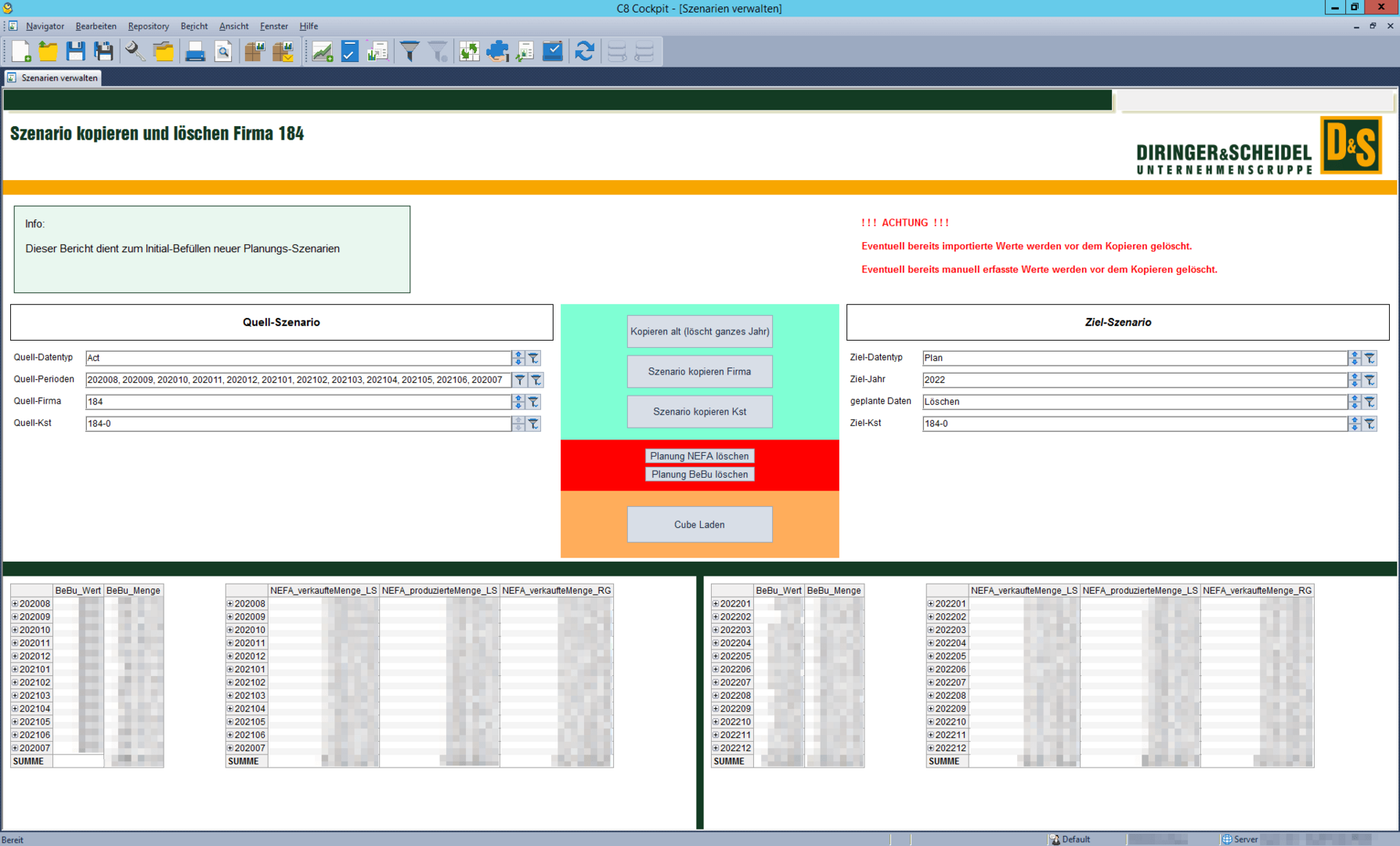 Das C8 Cockpit bildet das Frontend der Planungsapplikation und kann intuitiv und ohne Einarbeitungsaufwand bedient werden. Das bestehende Reportingsystem wurde zuerst optimiert und die Datenbankstrukturen überarbeitet, damit das IST-Reporting als Basis für die Planung genutzt werden kann. Die Daten dazu kommen aus der Finanzbuchhaltung und der Kostenrechnung. Der C8 Importer dient dabei als ETL-Tool und extrahiert die IST-Daten aus dem Vorsystem in die multidimensionale Microsoft Analysis Services Datenbank. Für die Befüllung des gewünschten Planungsszenarios werden die IST-Daten aus den ausgewählten Referenzzeitraum auf die entsprechende Planungsperiode kopiert, darauf aufbauend erfolgt die eigentliche Planung durch die Planungsverantwortlichen. Beim Kopieren kann sowohl das Quell- als auch Zielszenario beliebig konfiguriert werden und zwischen einzelnen Kostenstellen oder einer gesamten Firma gewählt werden.