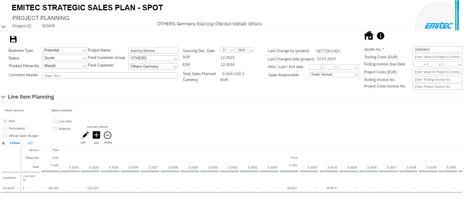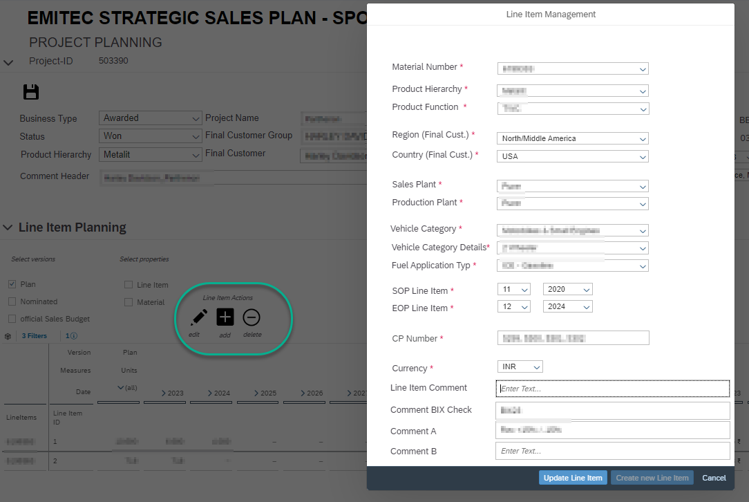 Die Preise und Absätze werden auf sogenannten „Line Items“ geplant. Ein Projekt kann mehrere Line Items haben. Jedem Line Item ist ein Material zugeordnet, welches eine Vielzahl an Eigenschaften besitzt. Auch das Line Item selbst hat zahlreiche Eigenschaften (Verkaufs- und Produktionswerk, Kunden Land/Region, SOP (Start of Production), EOP (End of Production), Kommentare, etc.)