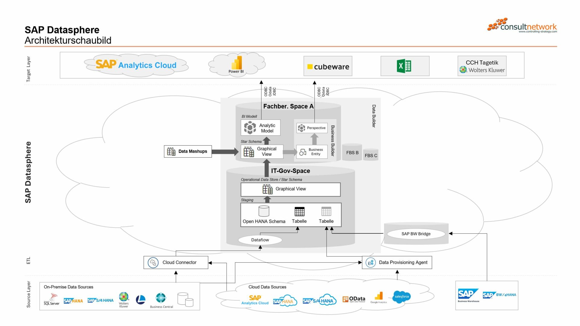 Im untersten Layer, dem Source Layer, finden wir die Datenquellen. Wir können On-Premise-Datenquellen wie MS SQL-Server, SAP HANA, CCH Tagetik oder Lucanet sowie Cloud-Datenquellen wie die SAP Analytics Cloud oder SAP S/4 HANA in der Cloud anbinden. Auch SAP BW kann über eine SAP BW Bridge problemlos angebunden werden.