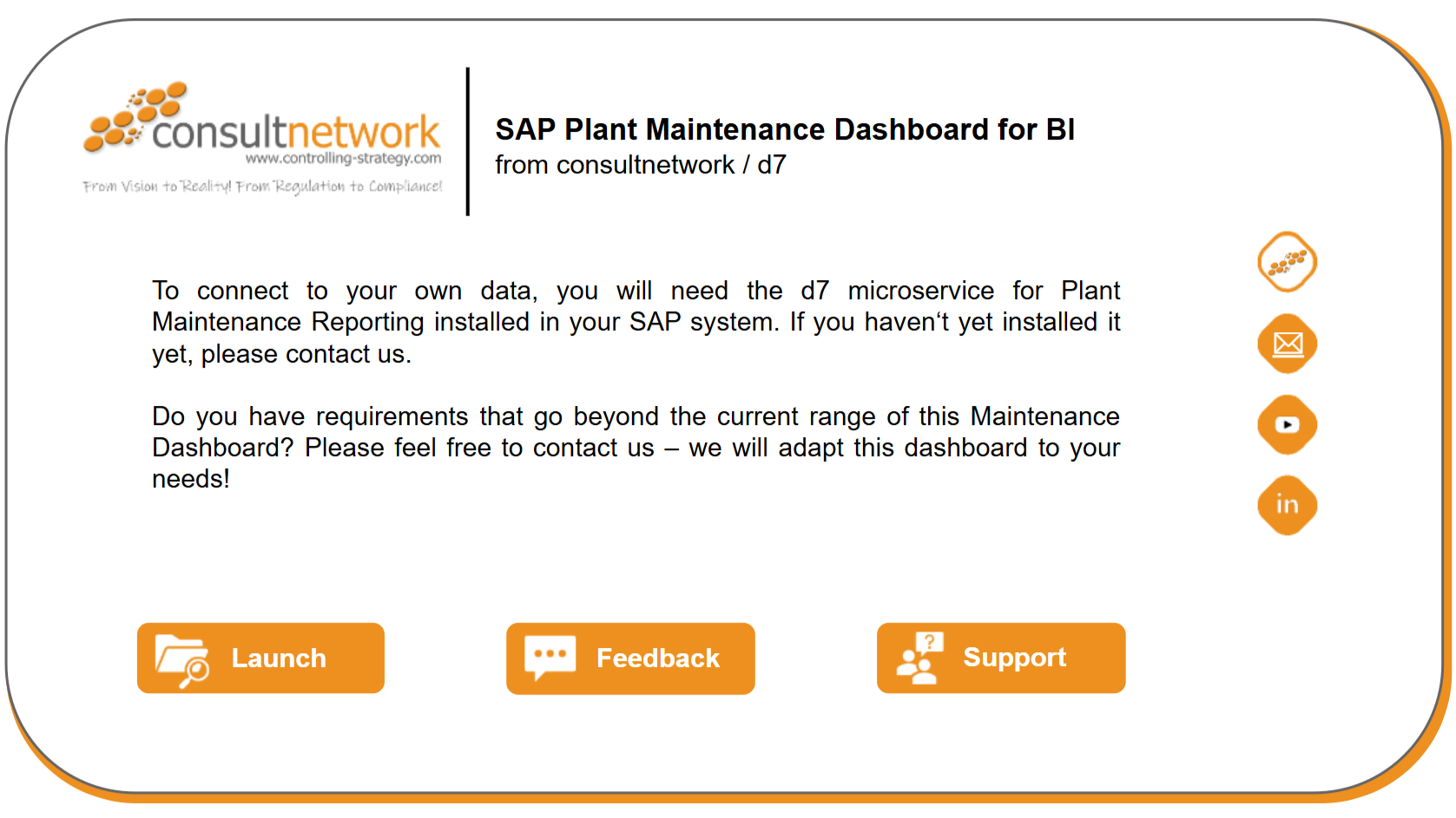 Diese Power BI-App interagiert direkt mit dem d7 KPI microservice für die Berichterstellung und nutzt definierte Services zum Datenexport. Sie bietet sofort einsatzbereite Berichte für relevante Standard-Instandhaltungs-KPIs, die aus vorhandenen Daten der Instandhaltungs- & Serviceprozesse in SAP ERP oder S/4HANA generiert werden.